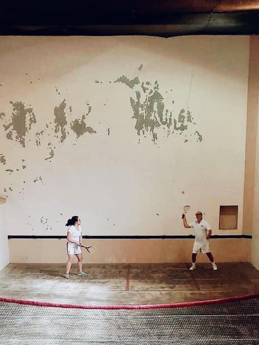 These courts were built in the 16th century and adapted for Trinquet (one of the many Basque ball sports) in the early 20th century.  They only ‘convert’ back to “Jeu de Paume” (translating literally as ‘game of the hand’) every two years for the week-long Trois Trinquet. All courts are shorter and narrower than the usual real tennis court, and most lack a back wall penthouse, and some a service penthouse. The tambour is also located directly against the back wall, so that if the ball hits it, it goes at 90 degrees along the back wall and is usually unplayable!